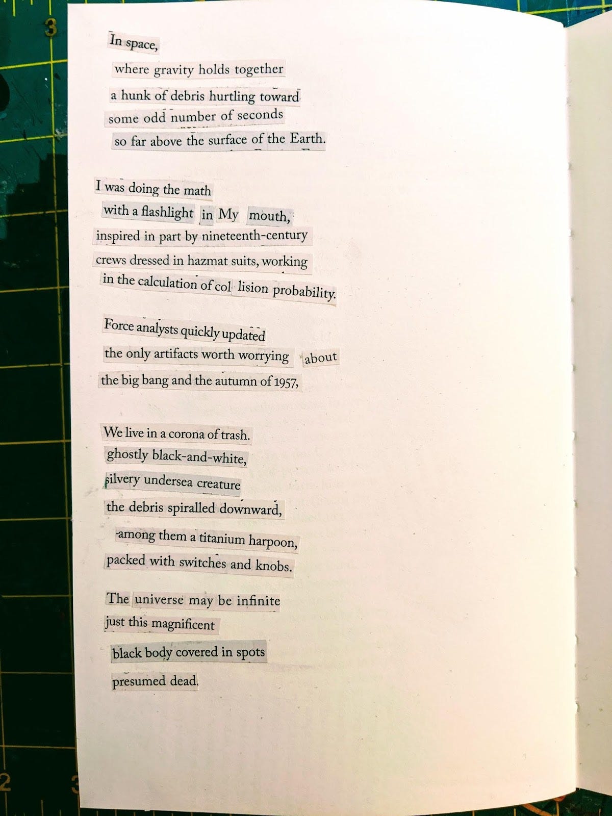 Collage has provided another entry point into crafting poems. Not having to face the tyranny of the blank page, or my blank mind, is liberating. Scouring magazines for words and phrases that ignite some unimagined trajectory of ideas, assembling one line after the next with more focus and intention, cutting and pasting delicate strips of soon-to-be sounds in the poem – this process is satisfying, sometimes tedious, usually rewarding. Here’s a poem constructed of pieces excised from a single article about the problem of space debris (it’s a thing!):