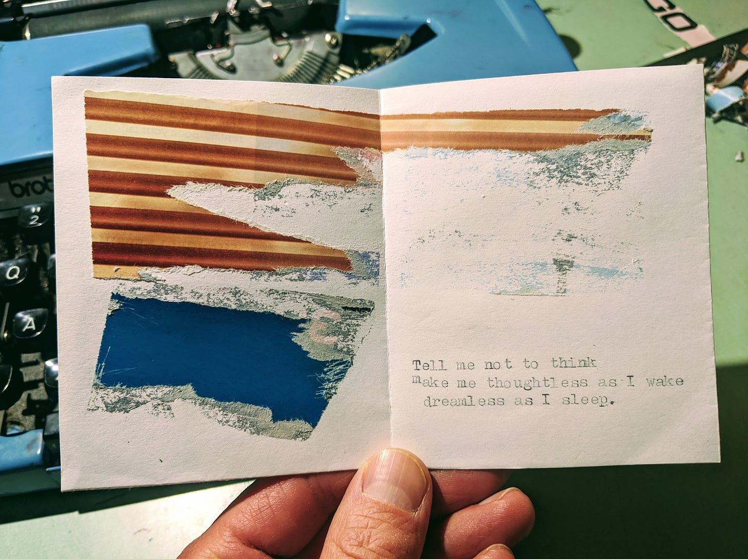 During this time, I found a medium that felt well suited to my mental state. I began to write poems more regularly, with more care and intention. Haiku – three lines containing five, seven, and five syllables respectively – have become my go-to form to loosen my mind and my pen, and my collection of these has grown. Some of these haiku gravitated toward each other, conversing unexpectedly as I placed them together in tiny zines with visual elements. Punching the words out with our lovely portable typewriter was physically therapeutic. I continue to write poems, wondering if “poet” could ever be added to my emerging and evolving identity. There are many threads, knotted and entangled; I try to sort them out. I try to remain ambivalent and unattached.