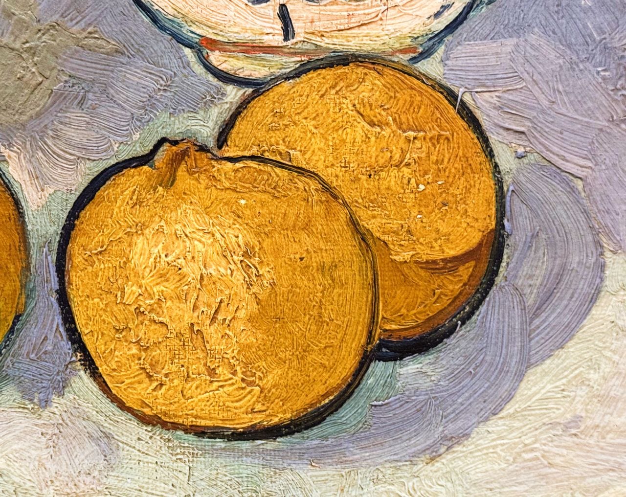 The paintings are familiar and warm, like a hand-thrown mug of tea my hands caress and care for, the comfort of its aromatic steam misting my nostrils and eyelashes. Matisse, van Gogh, de Chirico, Cézanne, Seurat... the so-called masters of early Modern Art. The greatest hits of a nostalgic White male ideal of Culture (the Canon). A diffuse blend of natural and artificial light blankets the rooms. Gold leaf picture frames with tacked brass nameplates enclose hundreds of invented worlds.